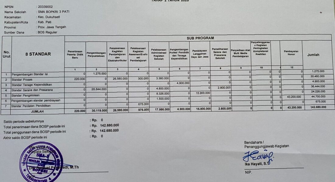 Rekapitulasi Realisasi Penggunaan Dana BOSP Tahap 2 Tahun 2025